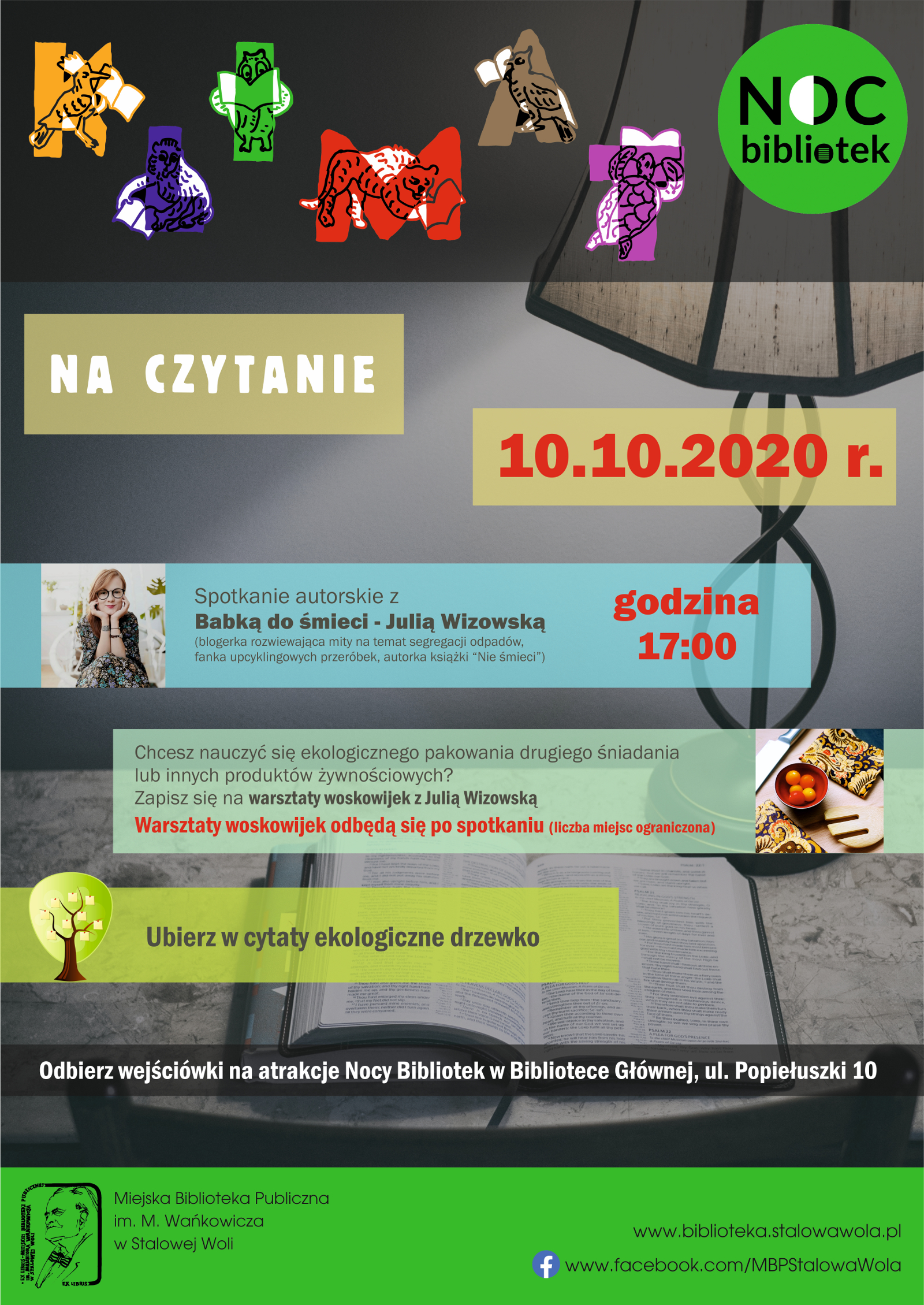 Zachęcamy również uczestników Nocy Bibliotek do literackiej zabawy, polegającej na ubraniu w jesienne liście naszego ekologiczno-bibliotecznego drzewka. Prosimy czytelników  o wpisywanie na papierowych liściach (dostępnych przy drzewku, na parterze siedziby głównej) cytatów, złotych myśli, ciekawych powiedzeń z literatury. Będzie również dostępna wystawa książek i audiobooków, podejmujących problematykę ekologii.