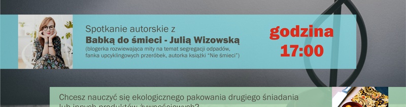 Po spotkaniu zapraszamy na warsztaty woskowijek, które poprowadzi sama Julia Wizowska.  Woskowijka to nic innego, jak ręcznie wykonane opakowania do przechowywania kanapek, przekąsek, warzyw, owoców i innych produktów spożywczych.  Co ciekawe, można ich używać wielokrotnie, żywność zachowa przy tym świeżość na dłużej. Na warsztaty obowiązują zapisy, liczba miejsc ograniczona. Zapewniamy wszystkie niezbędne materiały.