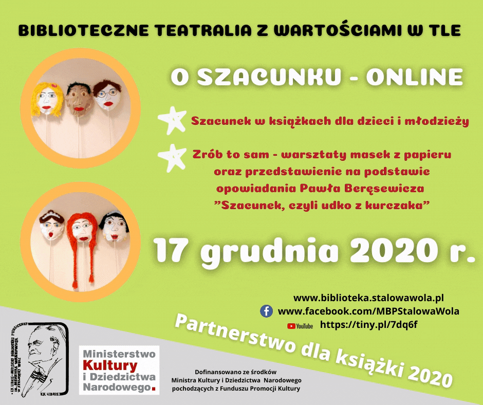 Działanie zostało zrealizowane w ramach zadania "Biblioteczne teatralia z wartościami w tle" dofinansowanego ze środków MKiDN z Funduszu Promocji Kultury pod honorowym patronatem Lucjusza Nadbereżnego Prezydenta Miasta Stalowa Wola.