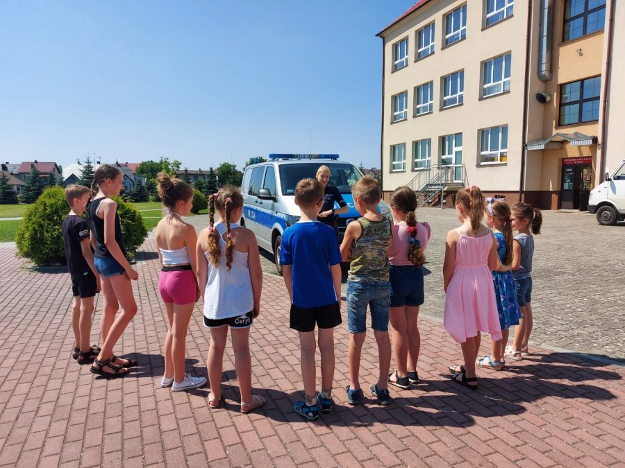 Policjantka poruszyła także tematy związane z zagrożeniami, jakie mogą pojawić się podczas zabawy na świeżym powietrzu, a także ostrzegała, jak unikać niebezpiecznych sytuacji np. podczas pomocy rodzicom przy pracach w domu. Podczas spotkania dzieci mogły wsiąść do policyjnego radiowozu.