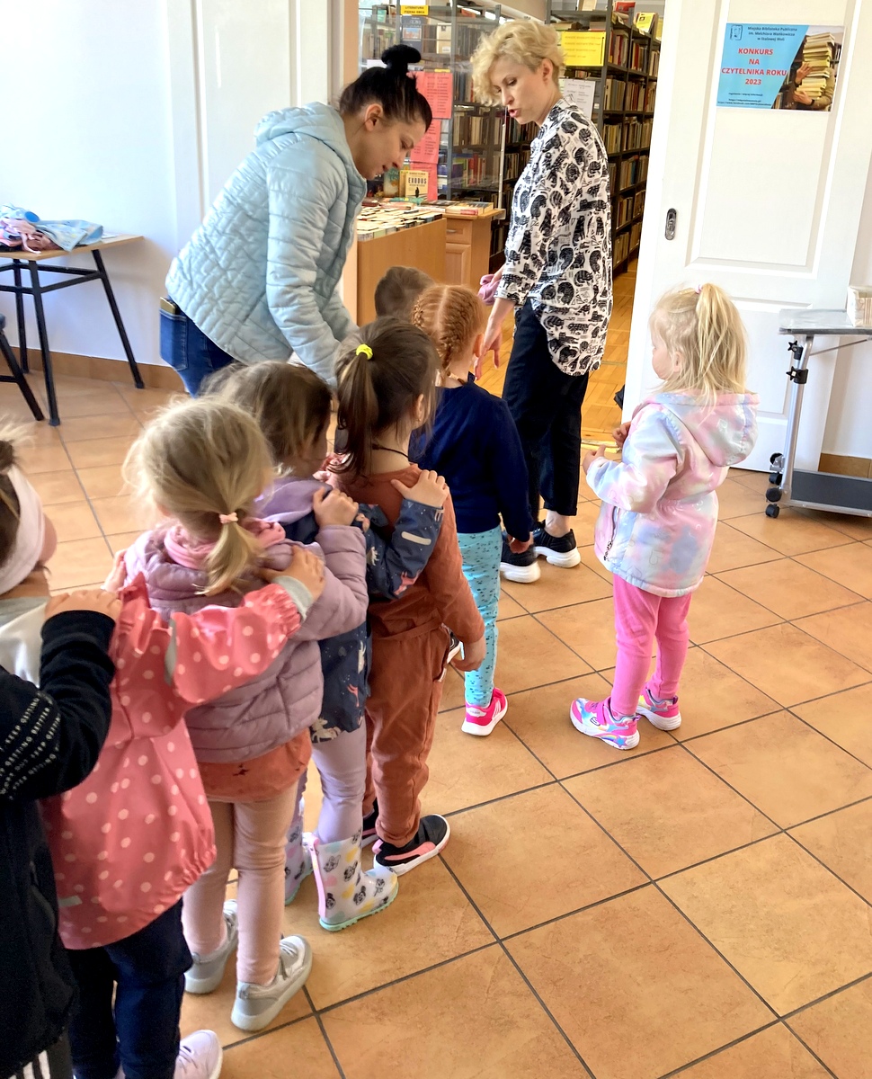 Maluchy zwiedziły Filię nr 2. Z zaciekawieniem obejrzały wypożyczalnię dla dorosłych i  zapoznały się z gazetami dziecięcymi dostępnymi w czytelni. Najwięcej czasu spędziły jednak w oddziale dla dzieci. Tutaj obejrzały bajeczki przeznaczane dla nich. Najbardziej zaciekawiły ich książki zabawki z okienkami oraz seria o Kici Koci i Samochodziku Franku.