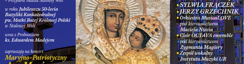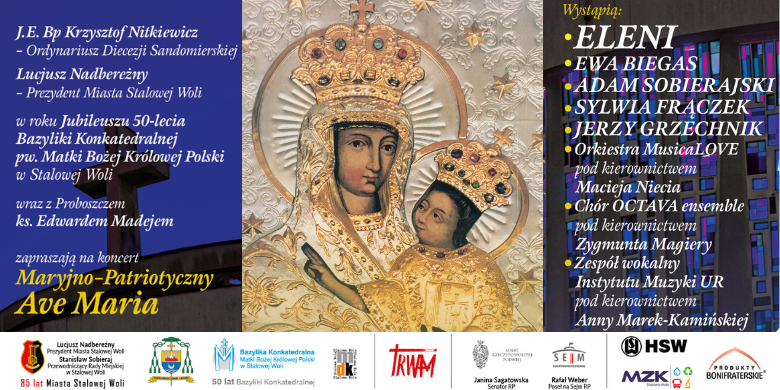 J.E. Bp Krzysztof Nitkiewicz, Lucjusz Nadbereżny Prezydent Miasta Stalowej Woli oraz Edward Madej Proboszcz Parafii pw. MB Królowej Polski w Stalowej Woli serdecznie zapraszają na koncert Maryjno-patriotyczny „Ave Maria”, który odbędzie się 3 maja (środa) o godz. 18:00 w Bazylice Konkatedralnej w Stalowej Woli.