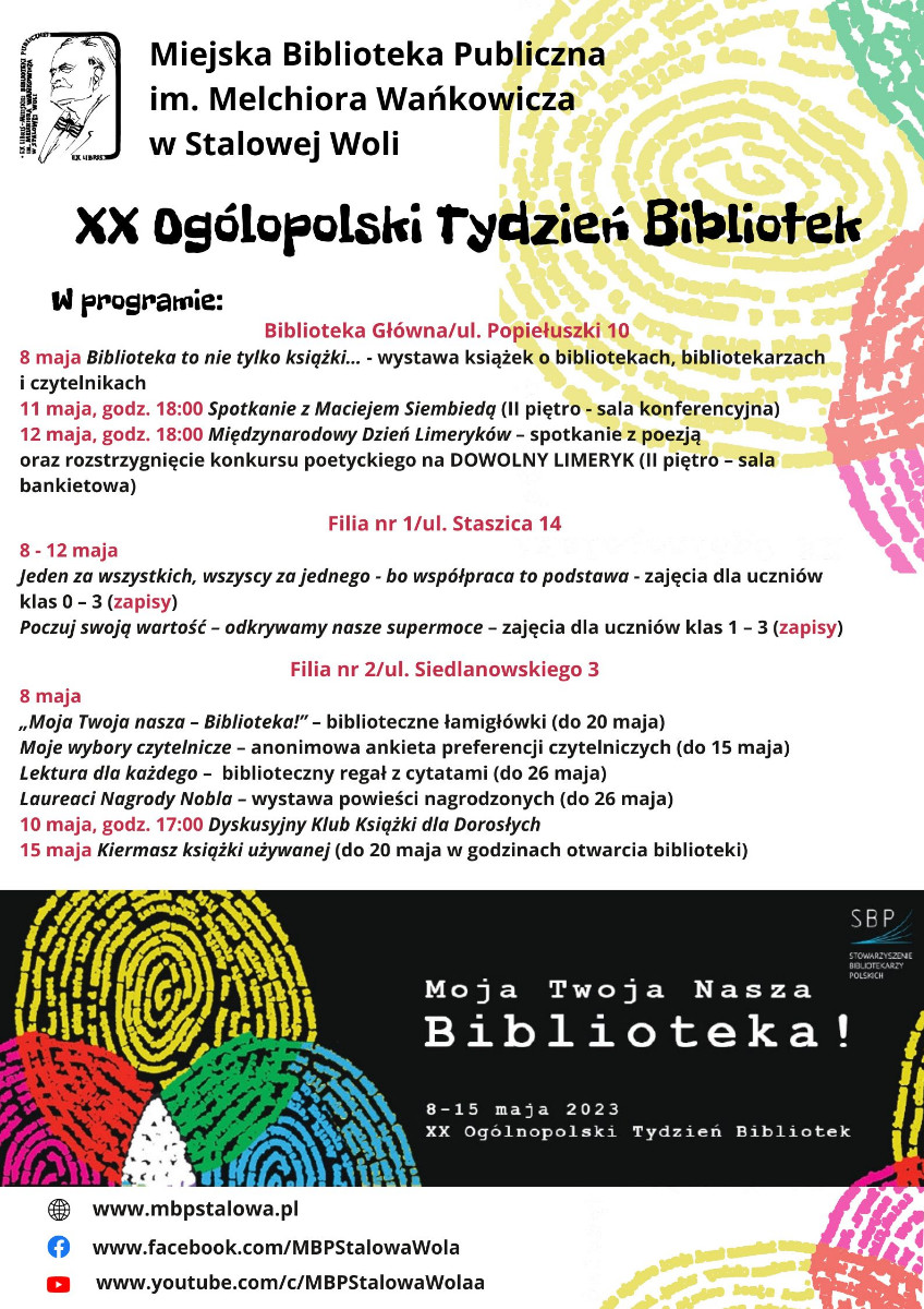 Tydzień Bibliotek jest ogólnopolską akcją promującą czytelnictwo i biblioteki, jednocześnie zaznaczającą nieocenioną pracę bibliotekarzy w dynamicznie rozwijającym się świecie informacji oraz animacji i edukacji kulturalnej. Głównym organizatorem obchodów jest Stowarzyszenie Bibliotekarzy Polskich w Warszawie. Oto jak hasło Tygodnia Bibliotek 2023 uzasadnia jego autorka, Jolanta Poważyńska z Koła SBP w Wałbrzychu – (…) Biblioteka jest jak przyjaciel, z którym dobrze spędza się czas. Jest otwarta na wszystkich. Zawsze można znaleźć w Niej coś ciekawego dla siebie. Może to być naukowa odpowiedź na jakieś zawiłe pytanie z dowolnej dziedziny lub odwrotnie – wciągnięcie w fantazyjny i nieoczywisty świat zawarty w książce lub w grze. Oferta Biblioteki jest tak różnorodna i dostosowana do potrzeb użytkowników, że każdy znajdzie coś w niej interesującego. To dlatego Bibliotekę można nazwać Moją, Twoją, Naszą i się z nią utożsamiać.