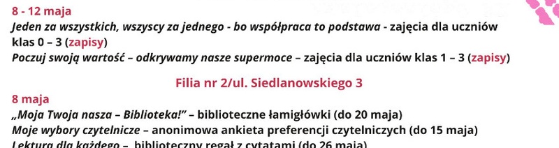 Dla miłośników kiermaszu książki używanej spieszymy z informacją, iż Filia nr 2, przy ul. Siedlanowskiego 3 udostępni ową propozycję 15 maja w godz. otwarcia placówki. Za symboliczną opłatą, Czytelnicy będą mogli wzbogacić swoje domowe biblioteczki, a uzyskane środki pieniężne zostaną przeznaczone na zakup nowości wydawniczych. Mamy również ofertę dla grup zorganizowanych. Od 8 do 12 maja uczniowie szkół podstawowych będą mogli skorzystać z zajęć: „Jeden za wszystkich, wszyscy za jednego - bo współpraca to podstawa”(klasy 0 – III) oraz „Poczuj swoją wartość – odkrywamy nasze supermoce” (klasy I – III). Zapisy na zajęcia prowadzi Filia nr 1, przy ul. Staszica 14, tel. 815 42 05 62. Zachęcamy nauczycieli i opiekunów do kontaktu.