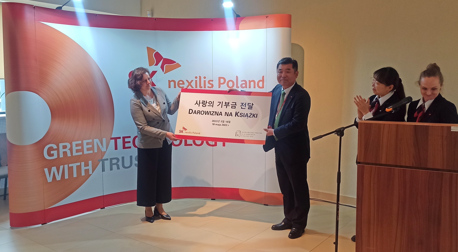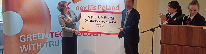 18 maja w stalowowolskiej Bibliotece Głównej odbywał się Dzień otwarty SK Nexilis Poland. Podczas oficjalnej prezentacji firmy, miała miejsce miła uroczystość. Hyun Woo Lee, Prezes SK Nexilis Poland Sp. z o.o. wręczył Beacie Życzyńskiej, dyrektor Miejskiej Biblioteki Publicznej im. Melchiora Wańkowicza w Stalowej Woli symboliczny czek – „Darowiznę na książki”. Dziękujemy!