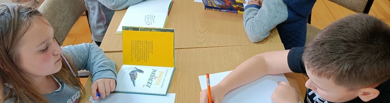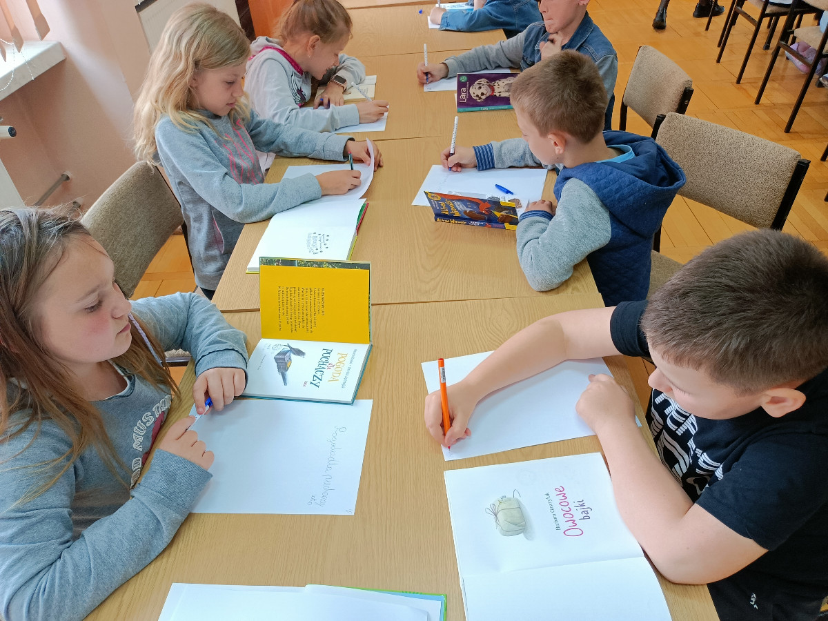 Ostatnim przystankiem wycieczki była czytelnia, w której to dzieci wysłuchały fragmentu opowieści Martina Widmarka pt. „Tajemnica biblioteki”. Na koniec spotkania nasi goście zapoznali się z wyglądem książki i wykonali zadanie polegające na znalezieniu i zapisaniu na kartce najważniejszych danych, które znajdują się na karcie tytułowej: tytuł, autor, tłumacz, ilustrator, wydawnictwo oraz miejsce i rok wydania. Dodatkowo dzieciaki odtworzyły ilustracje z książek.