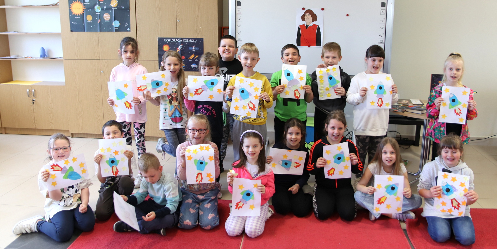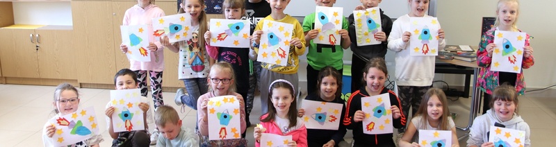 Były także ciekawe zadania. Pierwszym było ułożenie hasła z rozsypanki sylabowej, a następnie dzieci podzieliły się w sześć grup po trzy osoby i wspólnie ze swoją drużyną rozwiązywały rebusy, które potem zgadnięte hasła były omawiane. W końcowej części zajęć była pora na pracę plastyczną, w której to pierwszaki wyklejały własne rakiety i statki kosmiczne.