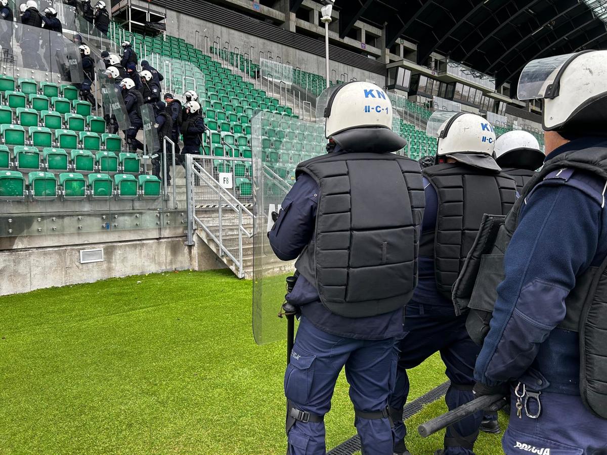Następnie funkcjonariusze udali się na stadion, gdzie wyposażeni w kaski, tarcze i środki przymusu bezpośredniego, ćwiczyli warianty przywracania naruszonego ładu i porządku. Tworzyli szyki zabezpieczające i wypierające, które stosowane są podczas działań pododdziałów zwartych.