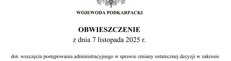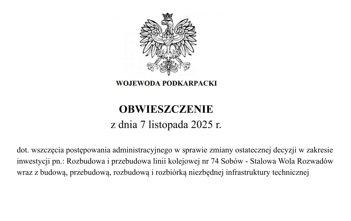 Na podstawie art. 9o ust. 6 ustawy z dnia 28 marca 2003 r. o transporcie kolejowym (Dz. U. z 2025 r., poz. 1234) oraz art. 155, art. 10 § 1 i art. 49 ustawy z dnia 14 czerwca 1960 r. Kodeks postępowania administracyjnego (Dz. U. z 2024 r. poz. 572, ze zm.) WOJEWODA PODKARPACKI ZAWIADAMIA że na wniosek Pana Piotra Grawicza – pełnomocnika PKP Polskie Linie Kolejowe S.A., ul. Targowa 74, 03-734 Warszawa, złożony w dniu 7 października 2025 r., zostało wszczęte postępowanie administracyjne znak: I-VII.747.2.14.2025 w sprawie zmiany ostatecznej decyzji znak: N-VIII.747.2.5.2023, z 2 lutego 2024 r., o ustaleniu lokalizacji linii kolejowej dla inwestycji pn.: „Rozbudowa i przebudowa linii kolejowej nr 74 Sobów – Stalowa Wola Rozwadów na odcinku od km 17,531 do km 23,342 wraz z budową, przebudową, rozbudową i rozbiórką niezbędnej infrastruktury technicznej na odcinku: