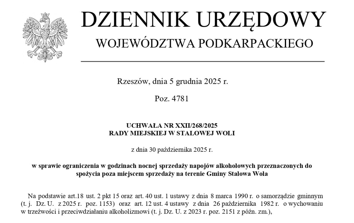 Przypominamy, że na podstawie Uchwały nr XXII/268/2025 Rady Miejskiej w Stalowej Woli z dnia 30 października 2025 r. w sprawie ograniczenia w godzinach nocnej sprzedaży napojów alkoholowych przeznaczonych do spożycia poza miejscem sprzedaży na terenie Gminy Stalowa Wola, na terenie naszego miasta wprowadza się ograniczenia nocnej sprzedaży napojów alkoholowych polegające na zakazie sprzedaży napojów alkoholowych przeznaczonych do spożycia poza miejscem sprzedaży między godziną 22:00 a 6:00.