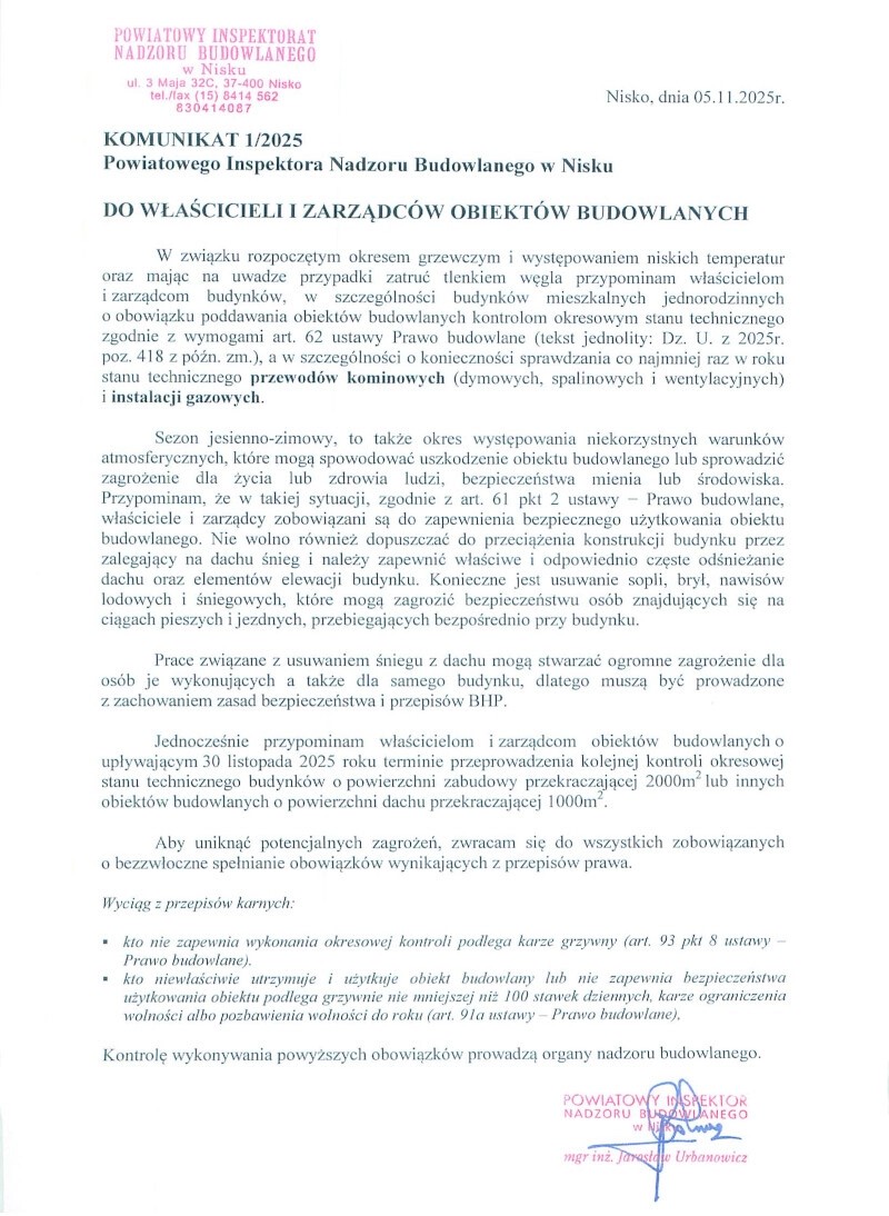 Przypominamy obowiązujący Komunikat 1/2025 Powiatowego Inspektora Nadzoru Budowlanego w Nisku z dnia 5 listopada 2025 r., skierowany do właścicieli i zarządców obiektów budowlanych.