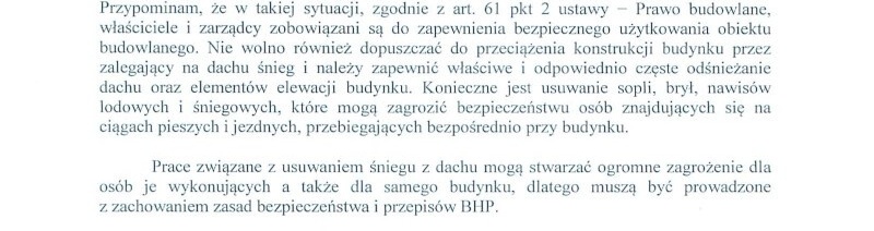 Sezon jesienno-zimowy, to także okres występowania niekorzystnych warunków atmosferycznych, które mogą spowodować uszkodzenie obiektu budowlanego lub sprowadzić zagrożenie dla życia lub zdrowia ludzi, bezpieczeństwa mienia lub środowiska. Przypominam, że w takiej sytuacji, zgodnie z art. 61 pkt 2 ustawy − Prawo budowlane, właściciele i zarządcy zobowiązani są do zapewnienia bezpiecznego użytkowania obiektu budowlanego. Nie wolno również dopuszczać do przeciążenia konstrukcji budynku przez zalegający na dachu śnieg i należy zapewnić właściwe i odpowiednio częste odśnieżanie dachu oraz elementów elewacji budynku. Konieczne jest usuwanie sopli, brył, nawisów lodowych i śniegowych, które mogą zagrozić bezpieczeństwu osób znajdujących się na ciągach pieszych i jezdnych, przebiegających bezpośrednio przy budynku.