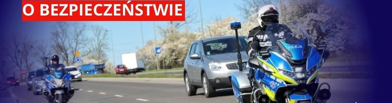 Grafika z napisem: Na drogach pamiętajcie o bezpieczeństwie. W tle dwaj funkcjonariusze na motocyklach i samochody osobowe na drodze.