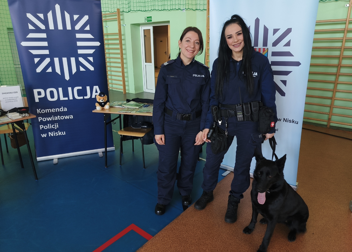 Z równie dużym zaciekawieniem młodzież zapoznała się z zadaniami jakie czekają na przewodnika psa służbowego - sierżant sztabowy Anna Powęska wskazała jak psy służbowe wspierają funkcjonariuszy m.in. w patrolowaniu terenu, poszukiwaniach osób zaginionych, wykrywaniu śladów przestępstw, wyszukiwaniu narkotyków i materiałów wybuchowych.