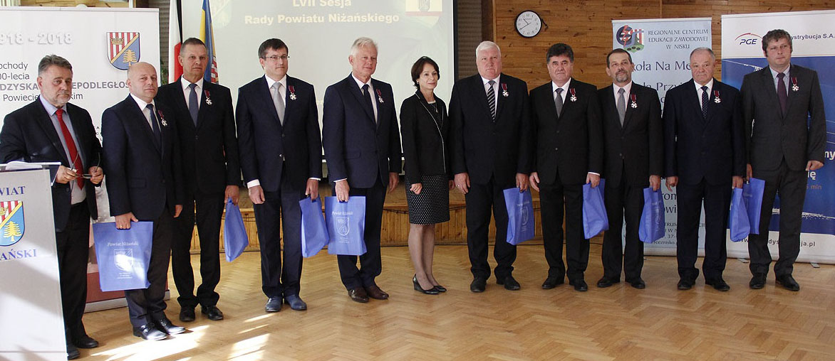Dnia 16 października 2018 r. w auli Regionalnego Centrum Edukacji Zawodowej w Nisku odbyła się LVII Sesja Rady Powiatu Niżańskiego, rozpoczęta Hymnem Rzeczypospolitej Polskiej. Uroczystość obecnością zaszczyciła Wicewojewoda Podkarpacki Lucyna Podhalicz, która wręczyła odznaczenia państwowe radnym Powiatu zasłużonym w pracy społecznej na rzecz Powiatu Niżańskiego, pracownikom Starostwa Powiatowego, Powiatowego Urzędu Pracy, Powiatowego Centrum Pomocy Rodzinie w Nisku za wzorowe, wyjątkowo sumienne wykonywanie obowiązków wynikających z pracy zawodowej, a także odznaki honorowe rolnikom prowadzącym gospodarstwa na terenie Powiatu.