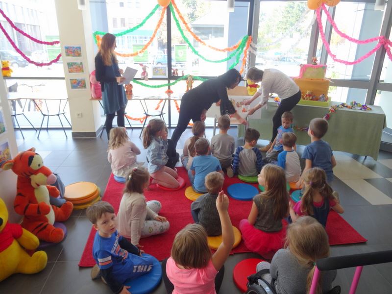 Ponadto, dzieci mogły wysłuchać opowiadania o urodzinach misia o małym rozumku oraz same mogły zapoznać się z książkami w kąciku małego czytelnika, gdzie czekały na nich bajki i opowiadania o misiu solenizancie i przygodach jego przyjaciół.