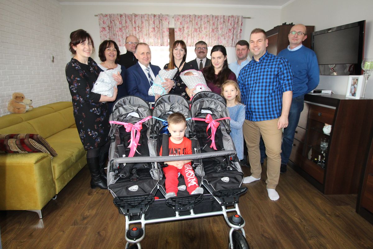 Łucja, Anna i Tymon – takie imiona wybrali dla swoich pociech Państwo Elżbieta i Przemysław Sowa z Przyszowa . To pierwsze trojaczki w naszej gminie od kilkudziesięciu lat. W piątek 8 lutego br. Szczęśliwą rodzinę odwiedził Wójt Gminy Bojanów Pan Sławomir Serafin wraz z pracownikami Urzędu oraz Radnymi z Przyszowa. Rodzice trojaczków otrzymali list gratulacyjny wraz z pakietem powitalnym oraz specjalną wyprawkę – wózek spacerowy triplet. Swoje podarunki dla maluchów przekazały również jednostki organizacyjne tj. Dom Opieki Dziennej z Maziarni oraz Gminny Ośrodek Kultury. Podczas piątkowej wizyty mama maluszków opowiedziała nam o swoim niesamowitym macierzyństwie i dotychczasowych przeżyciach. Pojawienie się jednocześnie trojga dzieci w domu to bowiem niemała rewolucja. Wyzwań w codziennym życiu również nie brakuje, tym bardziej, iż trojaczki mają jeszcze starsze rodzeństwo Dominika i Zuzię. Od narodzin minęło ponad trzy tygodnie i, jak mówi szczęśliwa mama, maluchy nie sprawiają większych problemów. Przyjście na świat trojaczków jest wyjątkowym wydarzeniem zapewne nie tylko dla rodziny, ale również dla naszej całej lokalnej społeczności. Rodzicom i maluszkom życzymy przede wszystkim wiele zdrowia oraz mnóstwa radosnych chwil spędzonych w gronie najbliższych.