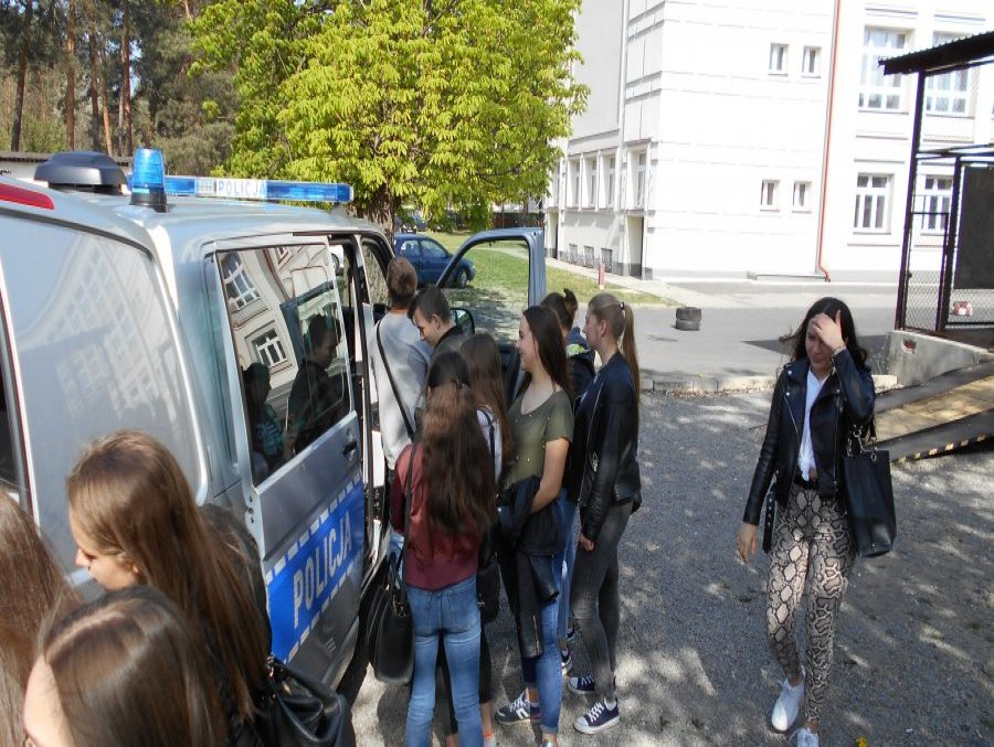 Uczniowie mieli okazję przymierzyć sprzęt ochrony osobistej policjantów, wykorzystywany przy wszelkiego rodzaju zabezpieczeniach, obejrzeć radiowóz oraz policyjny quad.