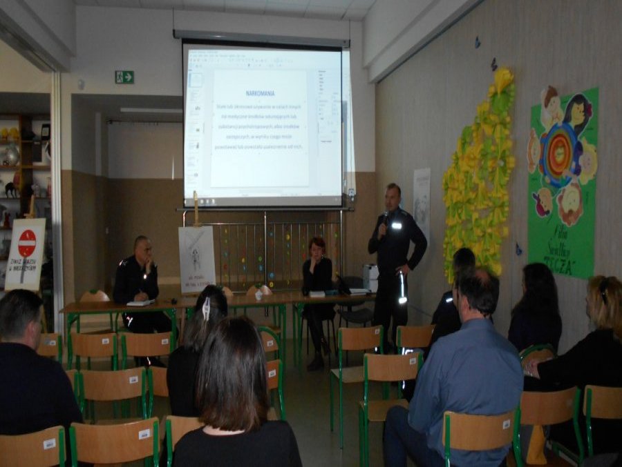 W roli prelegentów wystąpili: asp. szt. Robert Kotwica, który przedstawił problem narkotyków i dopalaczy w naszym regionie, powołując się na dane statystyczne oraz terapeuta psychoanalityczny - mgr. Katarzyna Dąbek, która przybliżyła kwestię zażywania wspomnianych środków z perspektywy uzależnionych osób nieletnich.