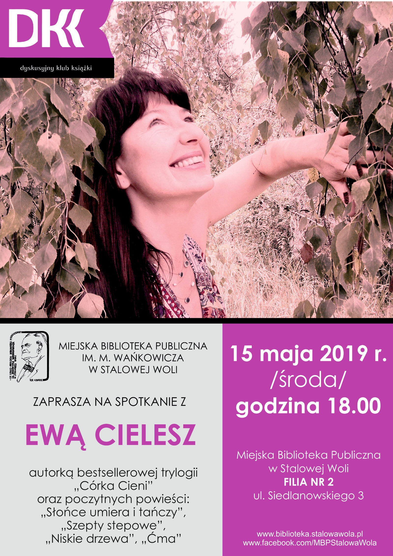 Podczas spotkania w MBP będzie możliwość zakupu książek Ewy Cielesz oraz zdobycia autografu autorki. Zapraszamy 15 maja na godzinę 18, do Filii Nr 2, ul. Siedlanowskiego 3.