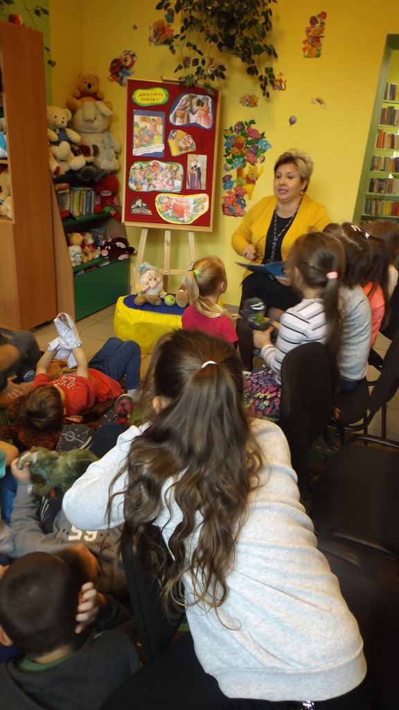 Kolejny raz grupa oddziału przedszkolnego z PSP nr 9 wzięła udział w zajęciach literacko-plastycznych „Czytamy bez mamy”. Dzisiaj głośno czytana była baśń „Królewna Śnieżka i siedmiu krasnoludków”, a następnie dzieci chętnie odpowiadały na zadawane pytania związane z baśnią. Prace z zajęć plastycznych wiszą w naszym bibliotecznym holu.