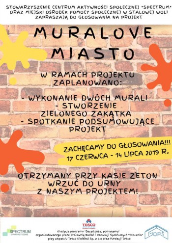 Miejski Ośrodek Pomocy Społecznej w Stalowej Woli wraz ze Stowarzyszeniem Centrum Aktywności Społecznej "SPECTRUM" w Stalowej Woli zaprasza wszystkich klientów sklepów Tesco w Stalowej Woli i Nisku do wzięcia udziału w głosowaniu w VI edycji programu "Decydujesz, pomagamy". Organizatorem przedsięwzięcia jest Pracownia Badań i Innowacji Społecznych "Stocznia" przy wsparciu Tesco Polska oraz Fundacji Tesco. Celem programu jest wspieranie aktywności i rozwoju w społecznościach lokalnych.