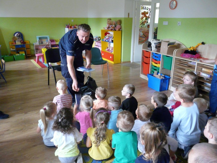 St. asp. Bernard Dul opowiadał maluchom, na czym polega praca policjanta i jak dbać o swoje bezpieczeństwo. Spotkanie było przypomnieniem, w jaki sposób unikać zagrożeń i bezpiecznie bawić się na podwórku podczas letniego wypoczynku. Policjant przestrzegał przed niebezpiecznymi zabawami w domu, przypomniał o konieczności trzymania się z daleka od ostrych przedmiotów i urządzeń rolniczych. Dzieci dowiedziały się o zasadzie ograniczonego zaufania w kontaktach z osobami obcymi.