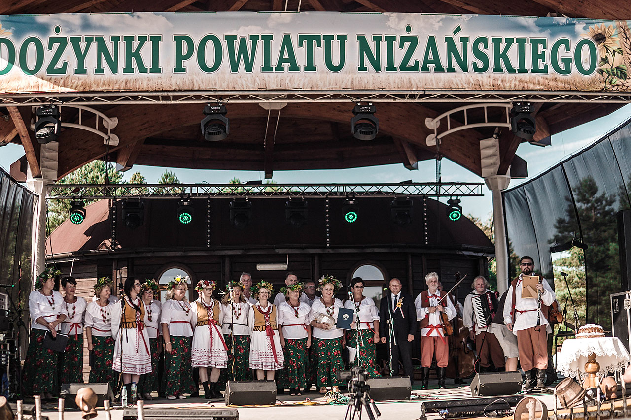 W sposób szczególny dziękuję za uświetnienie obrzędów i część artystyczną reprezentacjom gmin z terenu powiatu niżańskiego. Należy przypomnieć, że w nastrój taneczny wprowadził gości Zespół Pieśni i Tańca „Racławice” prezentując tańce ludowe. Kolejnym akcentem był występ Zespołu „Jargocianie”, działającego przy Gminnym Ośrodku Kultury, Sportu, Turystyki i Rekreacji w Jarocinie a za nimi zgromadzeni usłyszeli Kapelę Ludową „Jeżowianie”. Pierwszą część artystyczną zakończył występ Zespołu śpiewaczy „Wiklina” z Rudnickiego Klubu Seniora. Chór i Kapela Flisacka z Ulanowa to kolejni wykonawcy podkreślający ludowy charakter uroczystości. Młodszą część zgromadzonych przed sceną ucieszyły występy wokalne Oliwi Chamot i Oliwiera Szota. Gmina Gospodarza – Harasiuki zaprezentowała się poprzez występ Zespołu „Echo Roztocza” z Huciska. Podsumowaniem była prezentacja talentów wokalnych przez Grupę „NOBIS” działającą przy GOK w Krzeszowie.
