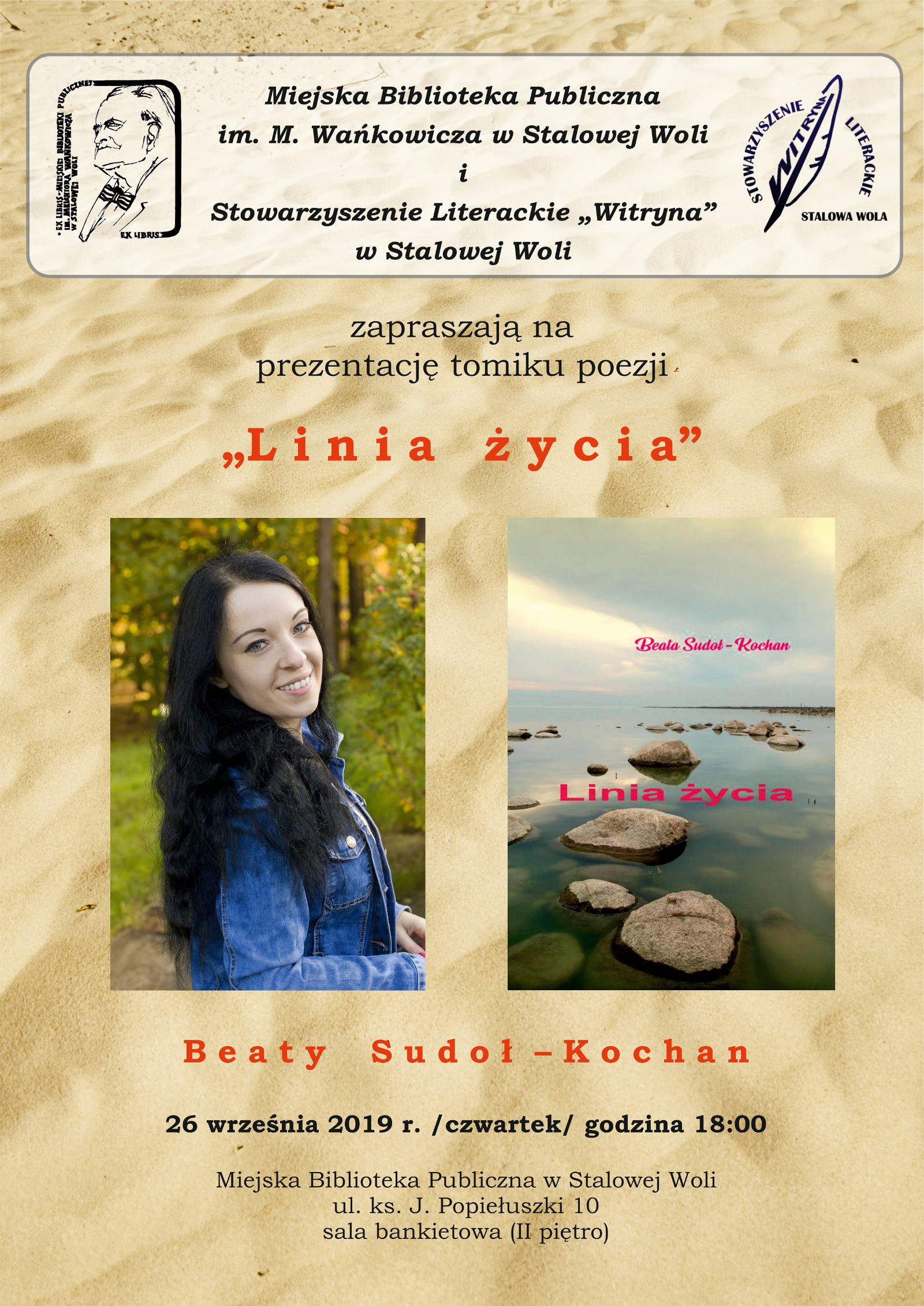 Miejska Biblioteka Publiczna im. M. Wańkowicza i Stowarzyszenie Literackie „Witryna” w Stalowej Woli zapraszają na prezentację tomiku poezji „Linia życia” Beaty Sudoł – Kochan. Literackie spotkanie zaplanowano na czwartek, 26 września 2019 r., o godzinie 18:00, w głównym budynku MBP, przy ul. ks. J. Popiełuszki 10, w sali bankietowej (II piętro).