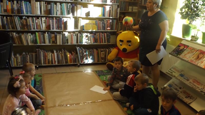W piątkowe przedpołudnie w Filii nr 3 było gwarno od samego rana dzięki maluchom z oddziału przedszkolnego z PSP nr 9. Dzieci z ogromną ciekawością zabrały się do malowania na dywanie tworząc kolorowe kontury jesiennych liści. Po ciężkiej pracy trzeba się zrelaksować toteż przedszkolaczki ćwiczyły celność rzucając piłeczkami do kosza, rozwiązywały błyskawicznie  łamigłówki, bo wiadomo, że „przedszkolak potrafi”.