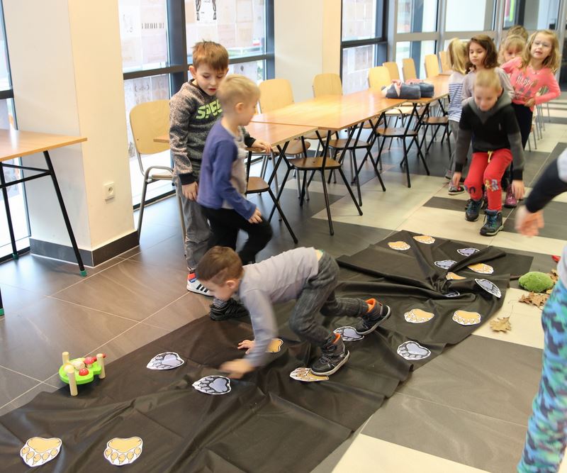 Nie mogło zabraknąć karmienia głodnego niedźwiedzia przysmakami takimi jak grzyby, ryby i miód wiec z grzybami a dokładnie z muchomorem związane było kolejne zadanie. Za pomocą dotyku dzieci odgadywały zawartość muchomora. W środku ukryte były takie przedmioty jak smoczek, piórko, piłeczka, szyszka, orzech i wiele innych. wiele radości sprawiła uczniom gra z kostką "Miś mówi... narysuj, wykonaj, zgadnij, odpowiedz". Na koniec wszyscy mieli okazję przekonać się czy mają wystarczająco siły by obudzić śpiącego misia specjalną łapką.